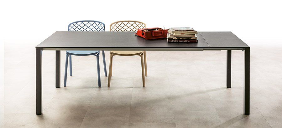 Struttura in estruso di alluminio di sezione 50x50mm, disponibile nelle finiture alluminio naturale, alluminio effetto inox e laccato in 8 tinte differenti, con meccanismo telescopico per prolunghe a scomparsa o fisso.