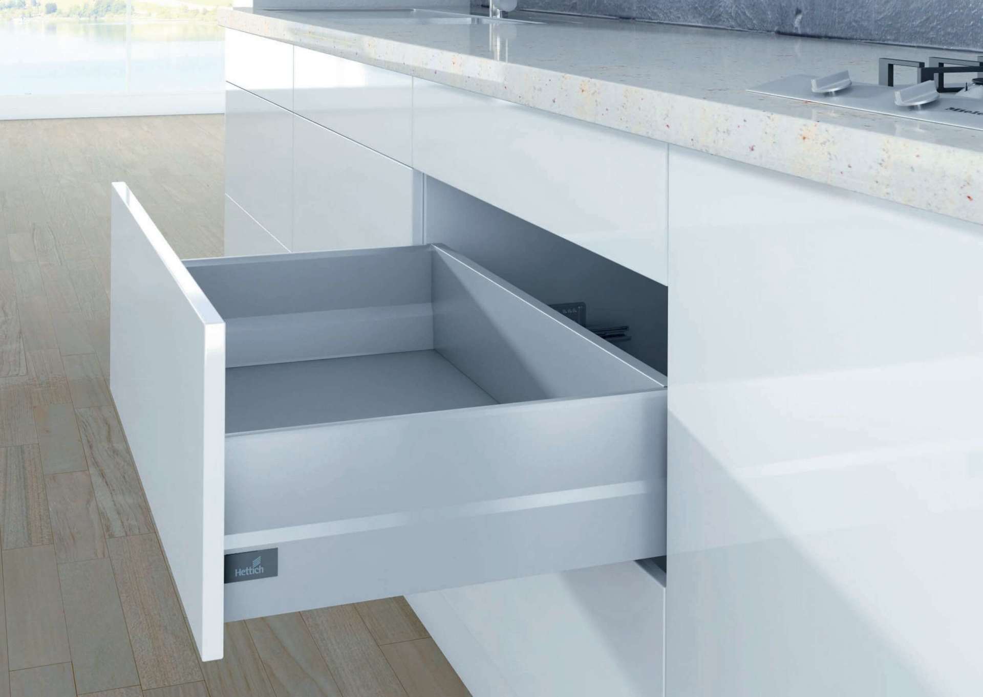 Cassetti in metallo con guida a scomparsa modello Acritech. Una nuova generazione di cassetti con una elevata adattabilità ai bisogni più diversi. I cassetti sono dotati delle nuove guide Actro con un'innovativo sistema a prismi, che permette un'eccellente confort di scorrimento, perfettamente armonizzato, ma anche un'ineguagliata stabilità, progettato per funzionare in qualsiasi configurazione con una portata massima di 80kg.
