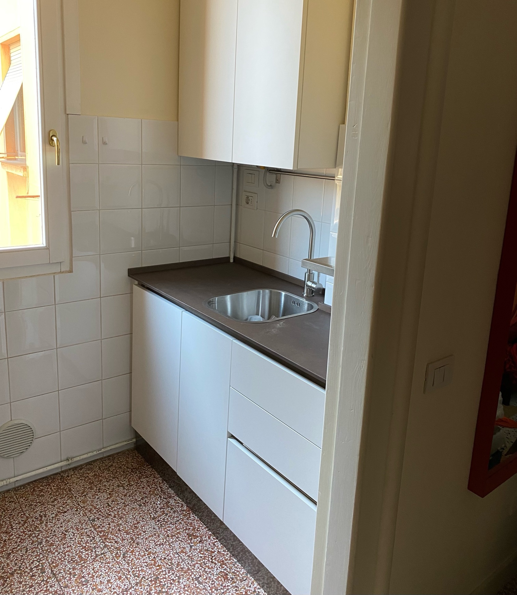 Ristrutturazione parziale di una cucina di piccole dimensioni. L’area è stata progettata per ottimizzare al massimo lo spazio e la funzionalità. Sul lato destro è stata installata una lavastoviglie di 45 cm di larghezza, abbinata a un lavello di dimensioni massime compatibili. Nella zona superiore è stata prevista una copertura per la caldaia. Nel restante spazio, sono state aggiunte mensole e mobili su misura per sfruttare al meglio le dimensioni disponibili. Sul lato opposto si trovano un forno, un piano cottura e una cappa sospesa. È stato incluso anche un cesto portabottiglie. Gli altri spazi sono stati arredati con mobili su misura. I mobili sono stati realizzati in laminato. Le maniglie sono a scomparsa con gole e zoccoli in alluminio di colore acciaio, mentre il piano è in laminato stratificato HPL.