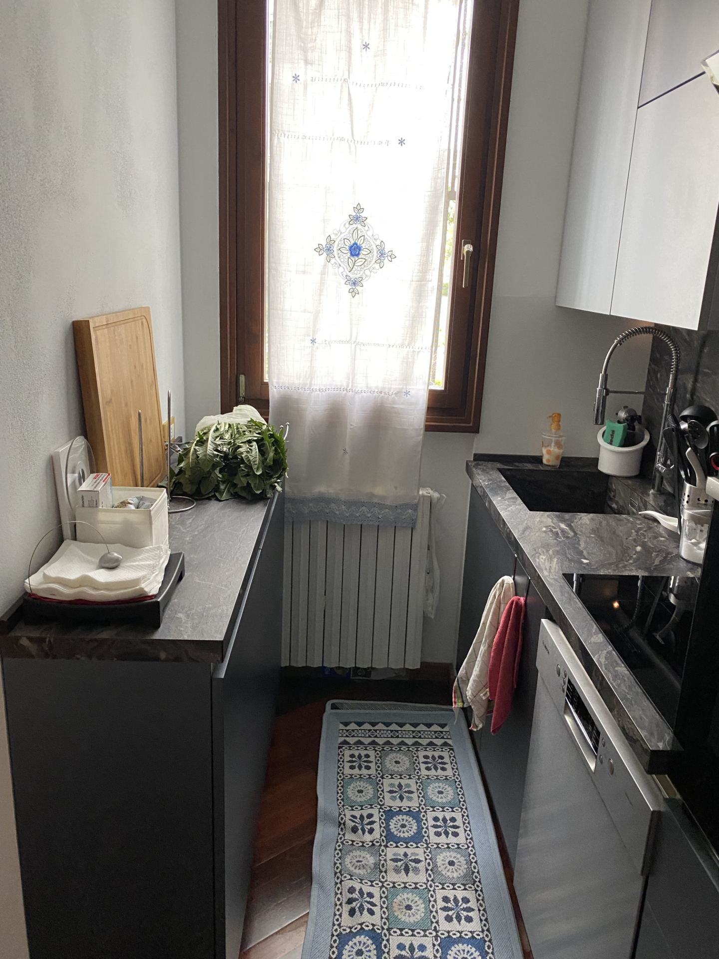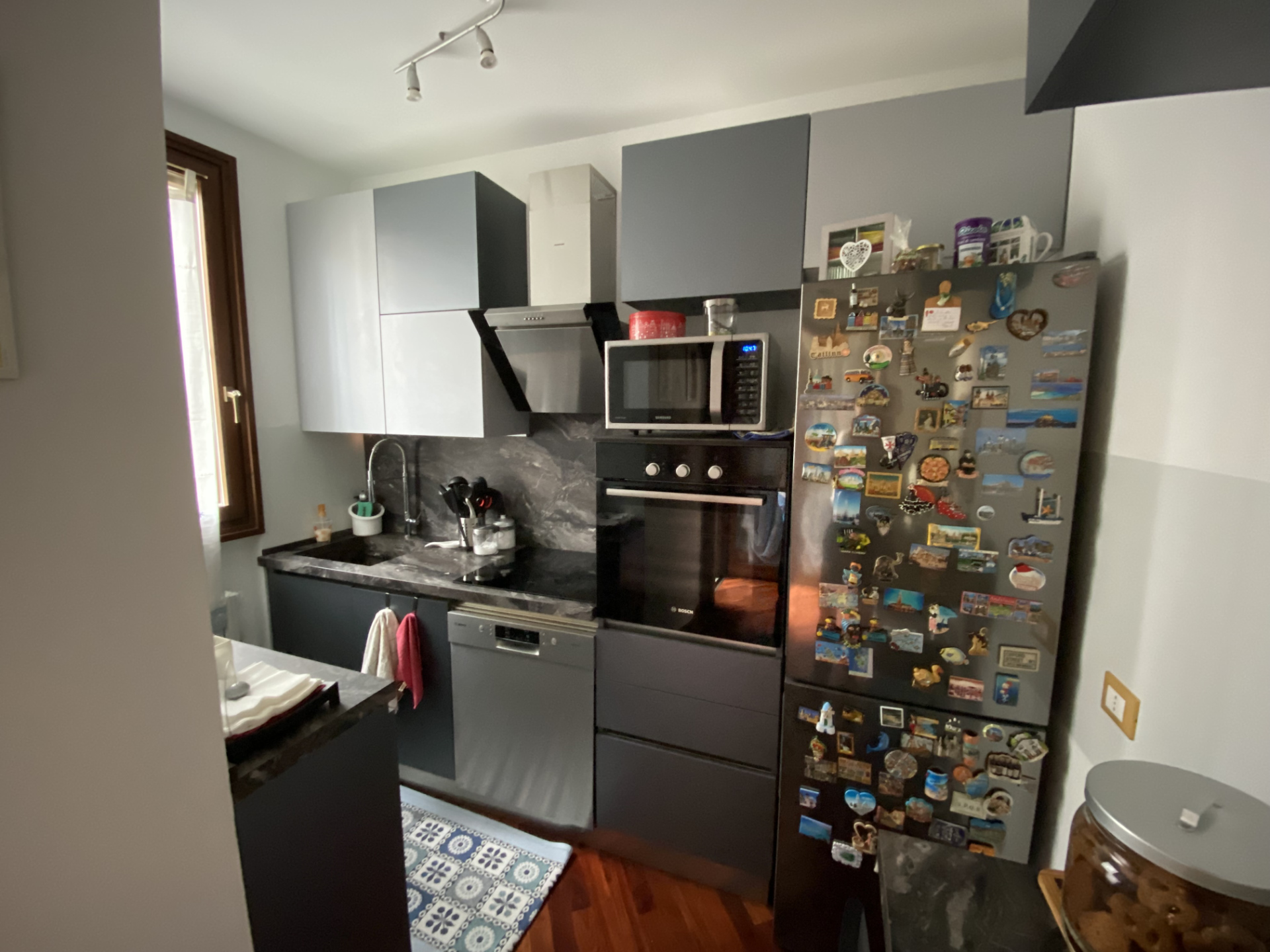 Rinnovo della cucina in un edificio di oltre 90 anni. Un aspetto distintivo di questo progetto è l'area attigua alla finestra, caratterizzata da una rientranza e pareti strette e non in squadro. I mobili in questa zona sono stati progettati per ottimizzare lo spazio disponibile; il piano di lavoro è stato tagliato e modellato sul posto per adattarsi perfettamente all'area. Sul lato destro è stata inserita una mezza colonna per l’inserimento di un forno a libera installazione, mentre sul lato opposto è stato previsto un frigorifero anch'esso a libera installazione. I mobili sono stati realizzati in laminato con finitura similpelle, e il piano di lavoro è in laminato stratificato HPL. Maniglie a scomparsa, con gole e zoccoli in alluminio color acciaio. In seguito, è stata aggiunta una copertura in cartongesso sopra i pensili.