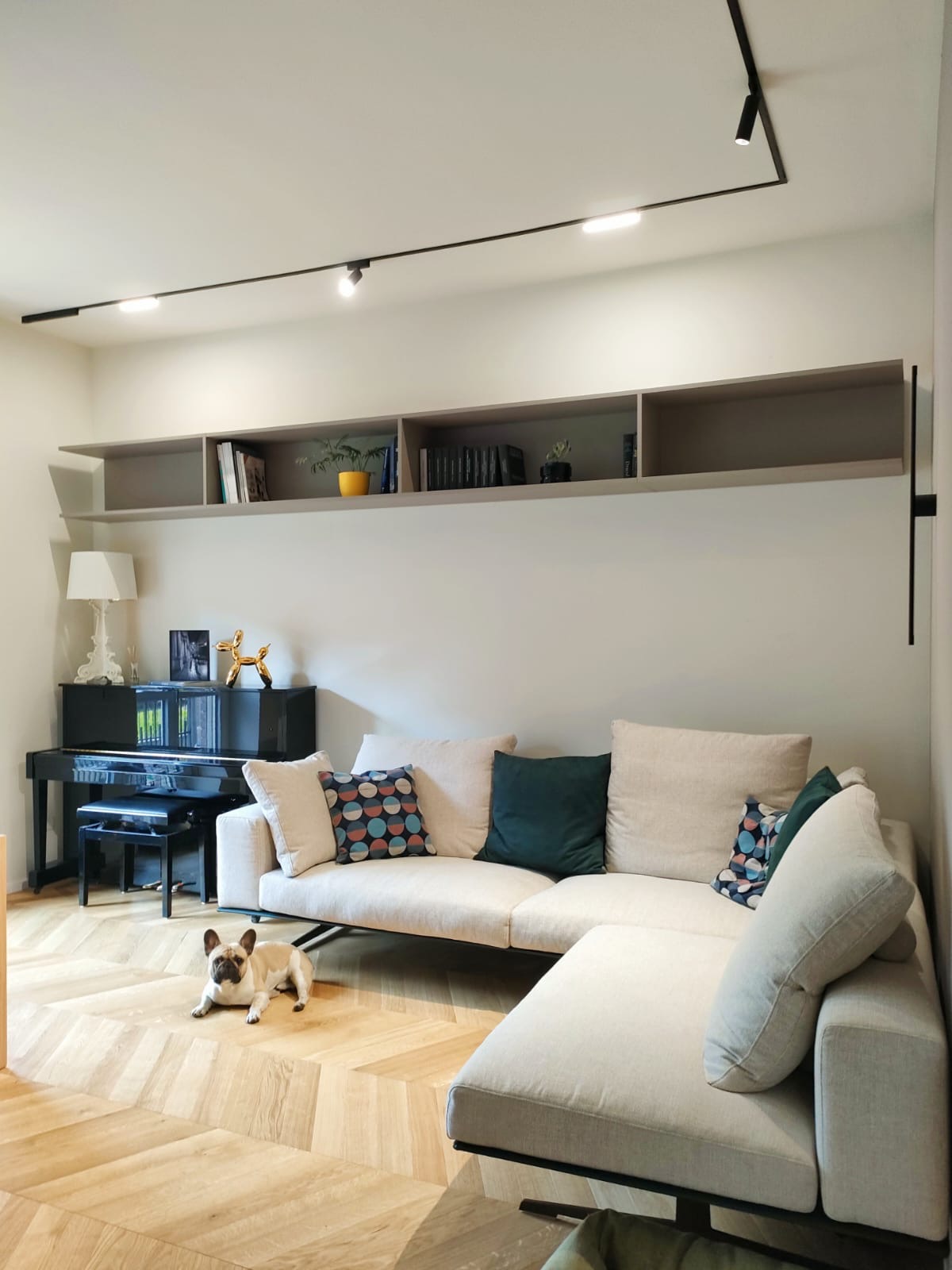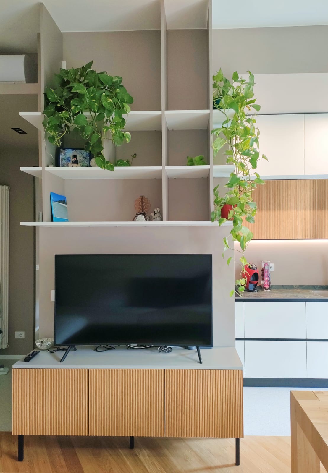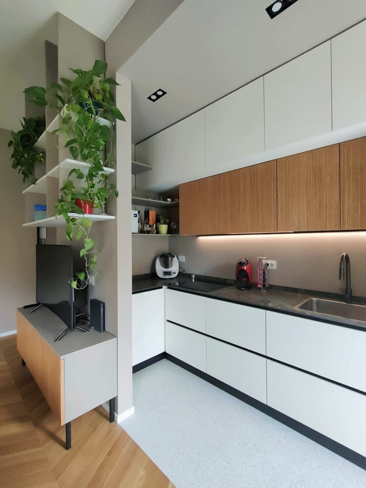 Ristrutturazione completa di un appartamento. Nella zona giorno è stata creata un'area open space che unisce la cucina e il soggiorno, favorendo un ambiente moderno e funzionale. I mobili scelti presentano omogeneità nei materiali e nei colori, contribuendo a un aspetto coeso. È interessante notare l'utilizzo di pannelli fresati in legno di rovere, utilizzati come rivestimento per alcune ante, che aggiungono un tocco di eleganza all'insieme. Le ante e le mensole della cucina sono state realizzate in laminato Alto Matt, mentre il mobile TV e il vano pensile sono anch'essi in laminato con una finitura seta. La cucina è dotata di una maniglia a scomparsa, e le gole e gli zoccoli sono di colore nero, contrastando con il piano cucina in grès. La vasca è in acciaio filotop, un'ottima scelta per l'estetica e la durabilità. È importante notare la presenza di una colonna con frigorifero da incasso posizionata a destra del forno, e sul lato opposto, in una nicchia, si trovano una base e un pensile, ottimizzando così lo spazio disponibile.
