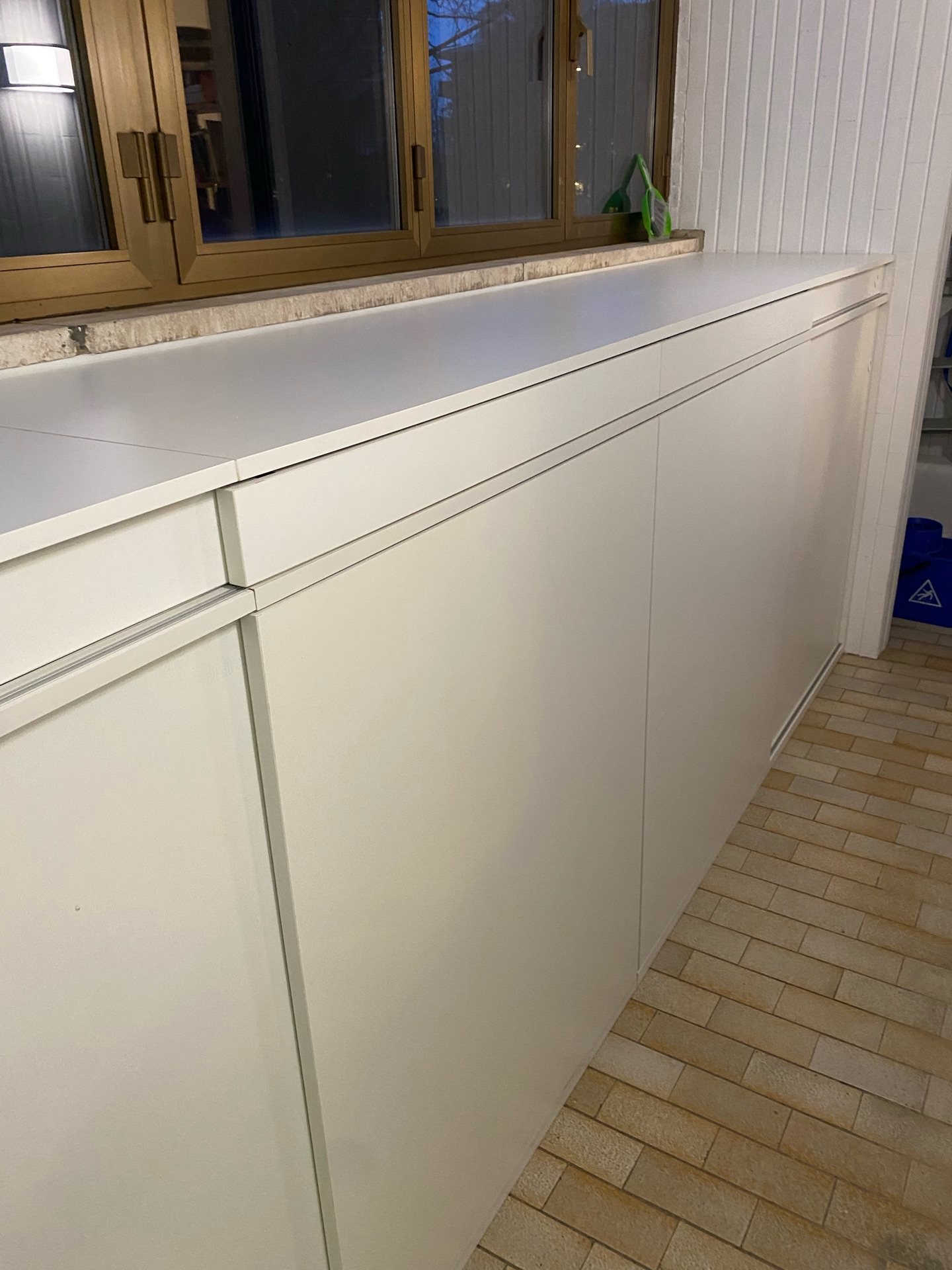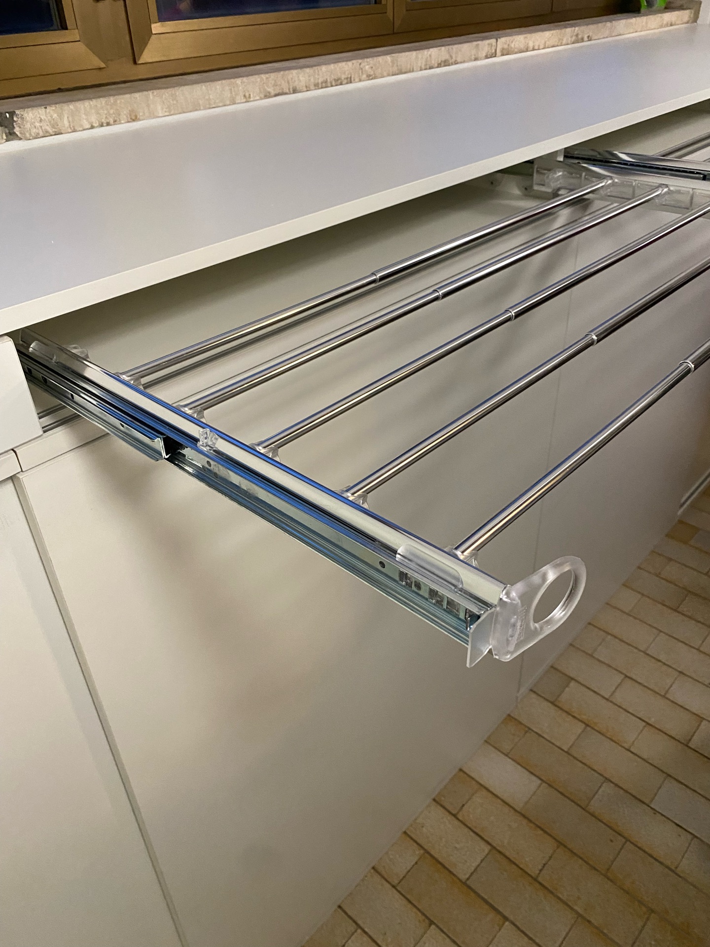 In un appartamento ristrutturato risalente agli anni '70, è stato creato un locale lavanderia in quello che era precedentemente un balcone. Questo ambiente presenta finestre su entrambi i muri più lunghi, influenzando così il design del mobile, che è stato adattato per rimanere basso in altezza e ottimizzare l'uso dello spazio disponibile. Per migliorare la funzionalità del locale, è stato scelto di impiegare ante scorrevoli interne per non ridurre il passaggio già limitato dal mobile. Inoltre, è stata adottata una soluzione innovativa con porta pantaloni estraibili utilizzati come stendibiancheria. Sul lato sinistro del mobile, il muro ha una forma curva; di conseguenza, il piano è stato sagomato per adattarsi a questa curvatura, sfruttando così lo spazio risultante. L'arredo è stato realizzato in laminato.