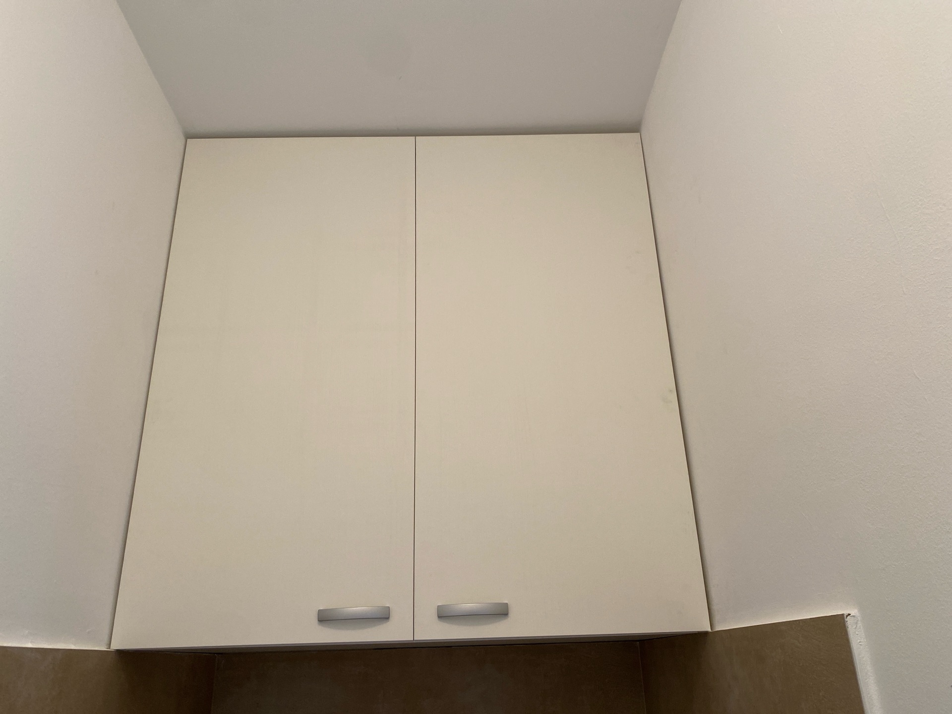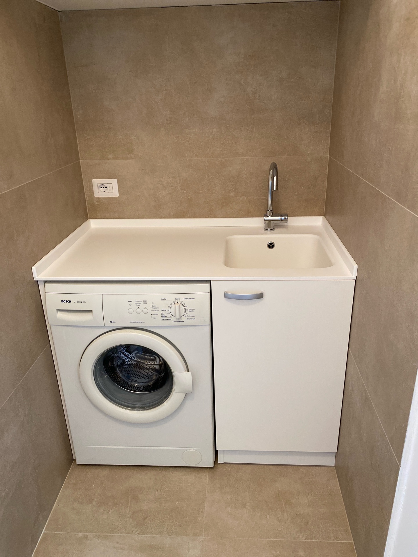 Appartamento ristrutturato con un bagno. All'interno di quest'ultimo è stata creata una nicchia per l'installazione di un mobile lavanderia, realizzata con un muro. Il mobile è suddiviso in tre sezioni: la parte inferiore è destinata alla lavatrice ed è dotata di due ante; il vano centrale, aperto, funge da piano di lavoro e spazio per riporre i detersivi; la parte superiore presenta un ripiano con due ante, utile per ulteriori storage. Il mobile è realizzato in laminato.