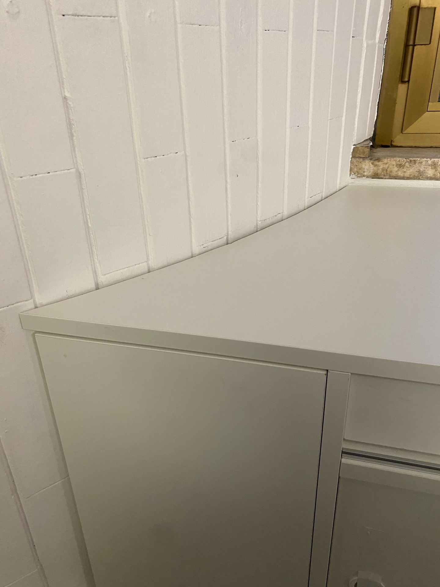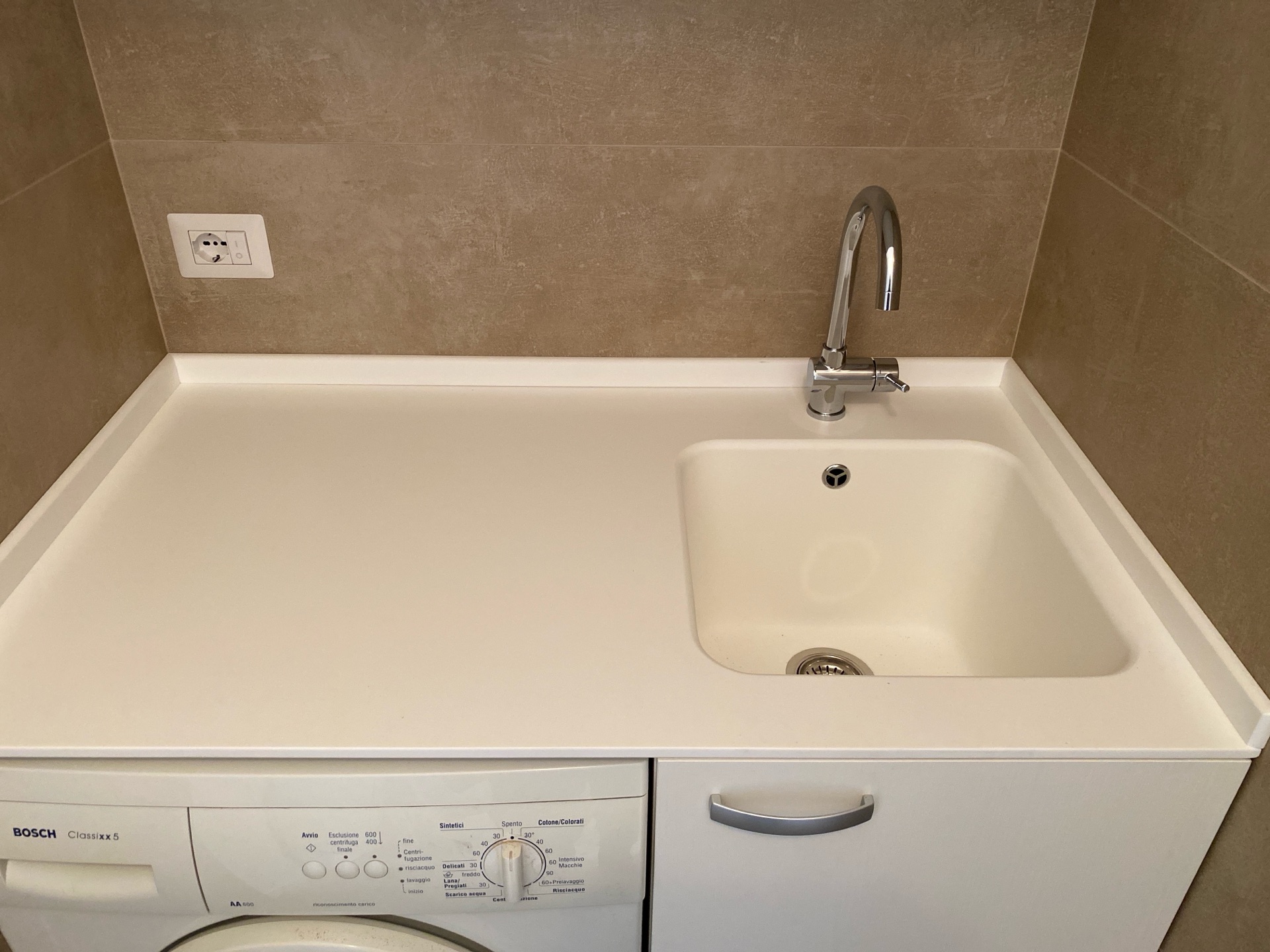 In un appartamento di nuova costruzione è stato installato un mobile lavanderia nel bagno. La struttura di questo mobile è realizzato in laminato con uno spessore di 4 cm e disponibile unicamente nel colore bianco per questa misura. La sua progettazione include una struttura portante priva di schienale e con ripiani fissi. Il mobile è suddiviso in due sezioni; la parte sinistra è meno profonda per permettere spazio al mobile del bagno. Sul lato opposto è presente un pensile sopra i sanitari, provvisto di un vano a giorno. Sia il pensile che le ante del mobile lavanderia sono costruiti in laminato dello stesso colore, garantendo uniformità estetica.