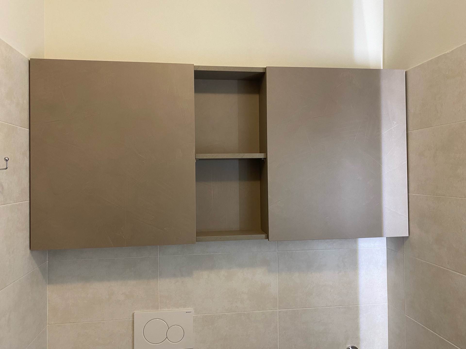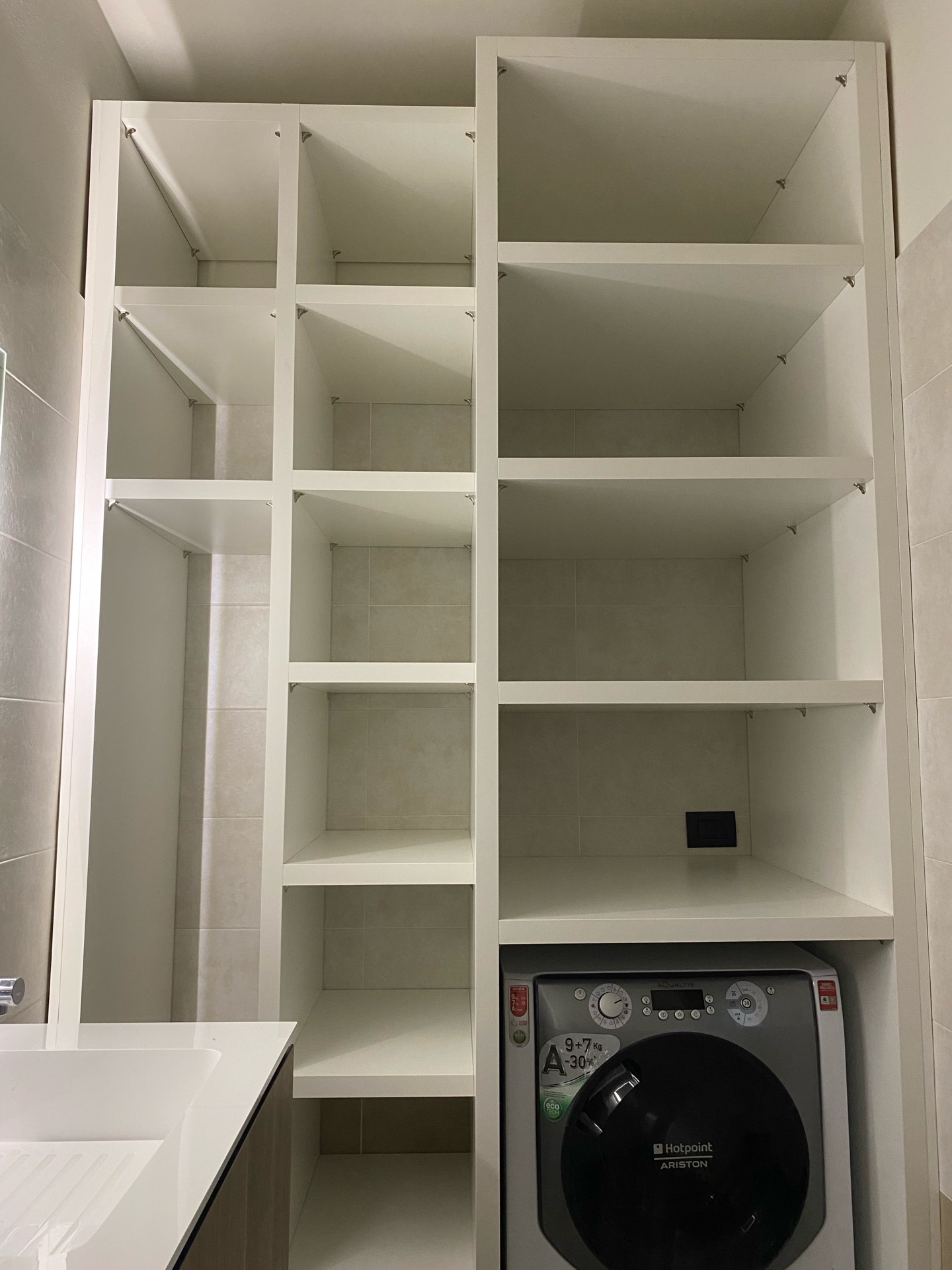 In un bilocale con bagno, è stato installato un mobile lavanderia. Questo mobile si distingue per la mancanza di ante e dispone di quattro ripiani fissi. Inoltre, il colore del mobile lavanderia doveva abbinarsi a quello del bagno già presente; per coincidenza, nel catalogo dei laminati era disponibile un colore identico a quello richiesto.