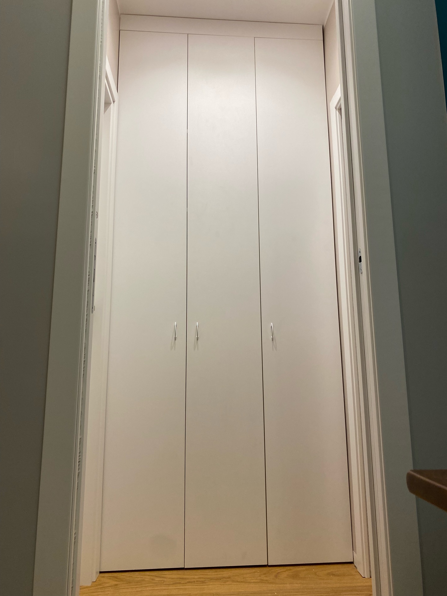 Piccolo antibagno con accesso a un bagno, una camera da letto e un soggiorno. Il mobile che lo arreda è dotato di una struttura portante priva di schienale, consentendo una maggiore versatilità. Tutti i ripiani sono fissi e progettati per ottimizzare lo spazio disponibile. Per adattarsi alla plafoniera installata a soffitto, è stata creata una fascia orizzontale che riduce l’altezza delle ante, facilitando così la loro apertura. Il mobile è realizzato in laminato, un materiale resistente e facile da pulire.