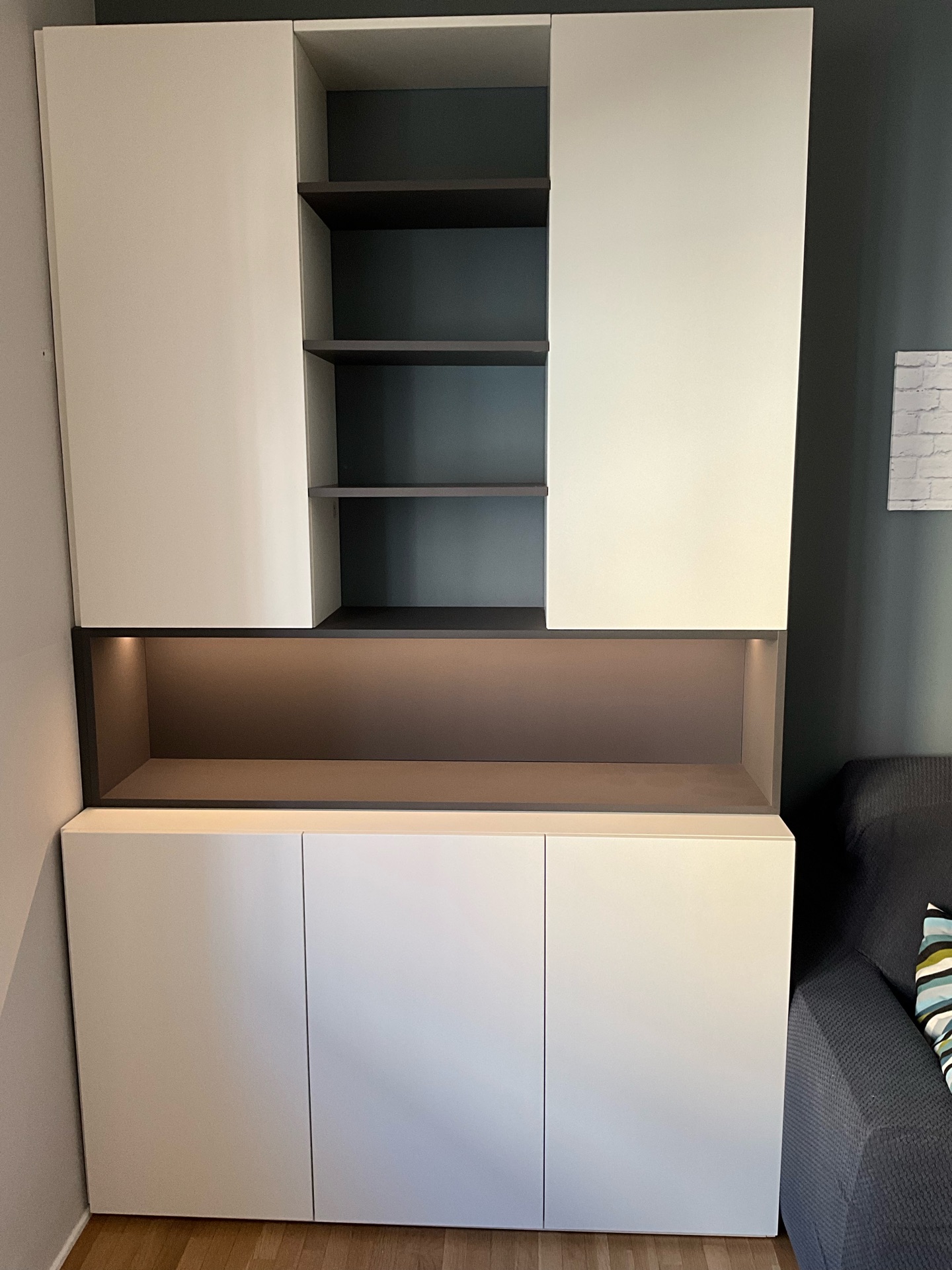 In un appartamento parzialmente ristrutturato, è stato rinnovato il soggiorno con l'inserimento di due mobili posti uno di fronte all'altro. La struttura interna di questi mobili è realizzata in laminato, con fianchi e ante di colore bianco e finitura laccata opaca. I dettagli in antracite sono in laminato Alto Matt. Il mobile più piccolo include un'illuminazione LED, dotata di un interruttore invisibile. Inoltre, è stata progettata una copertura per il termosifone, anch'essa in laminato, con due vetrine laterali. Davanti al copricalorifero, sono state installate delle fasce orizzontali con un sistema di montaggio a pressione, permettendo una facile rimozione se necessario. Infine, nell'ambiente sono presenti anche un tavolo e un divano.