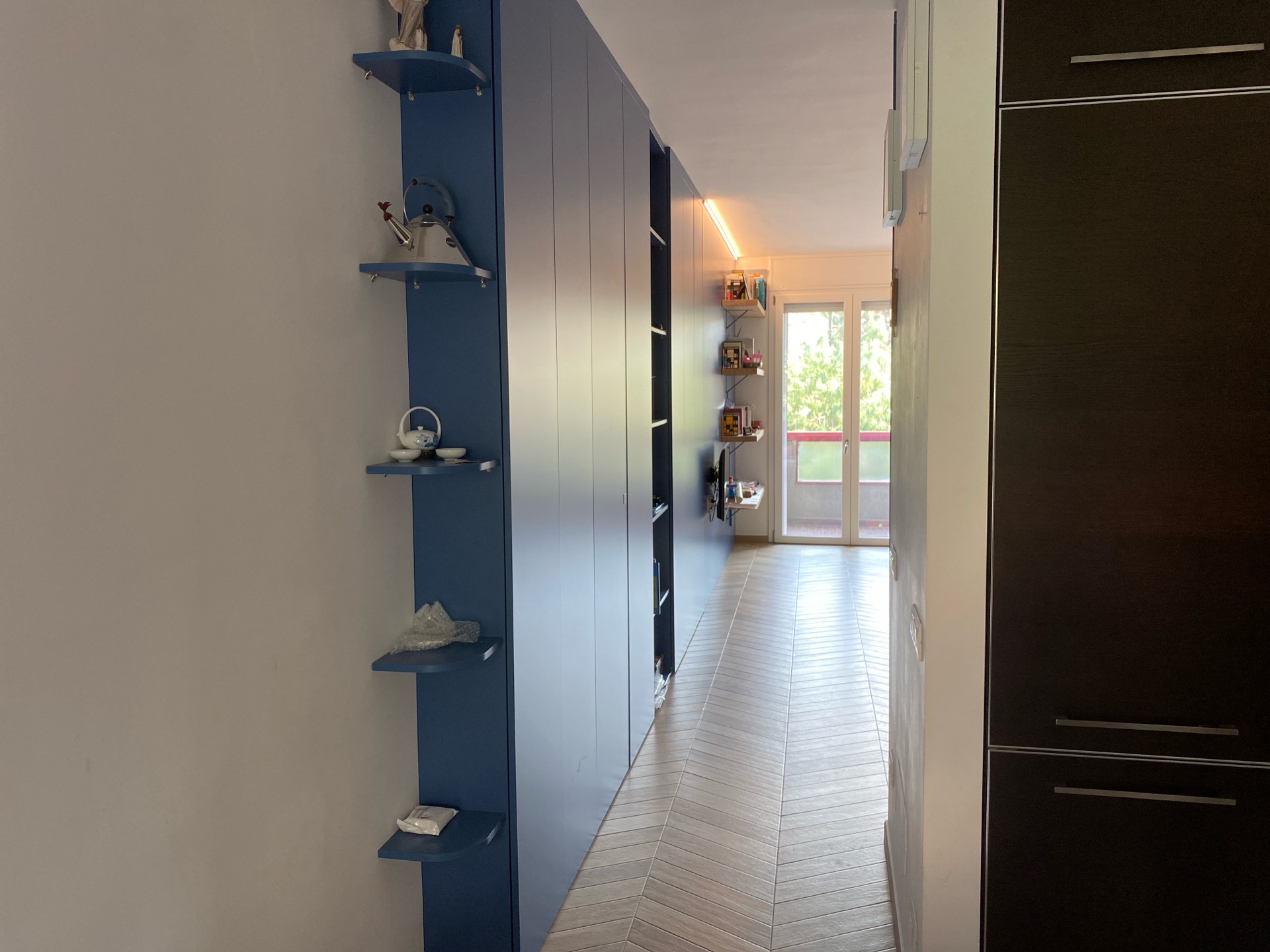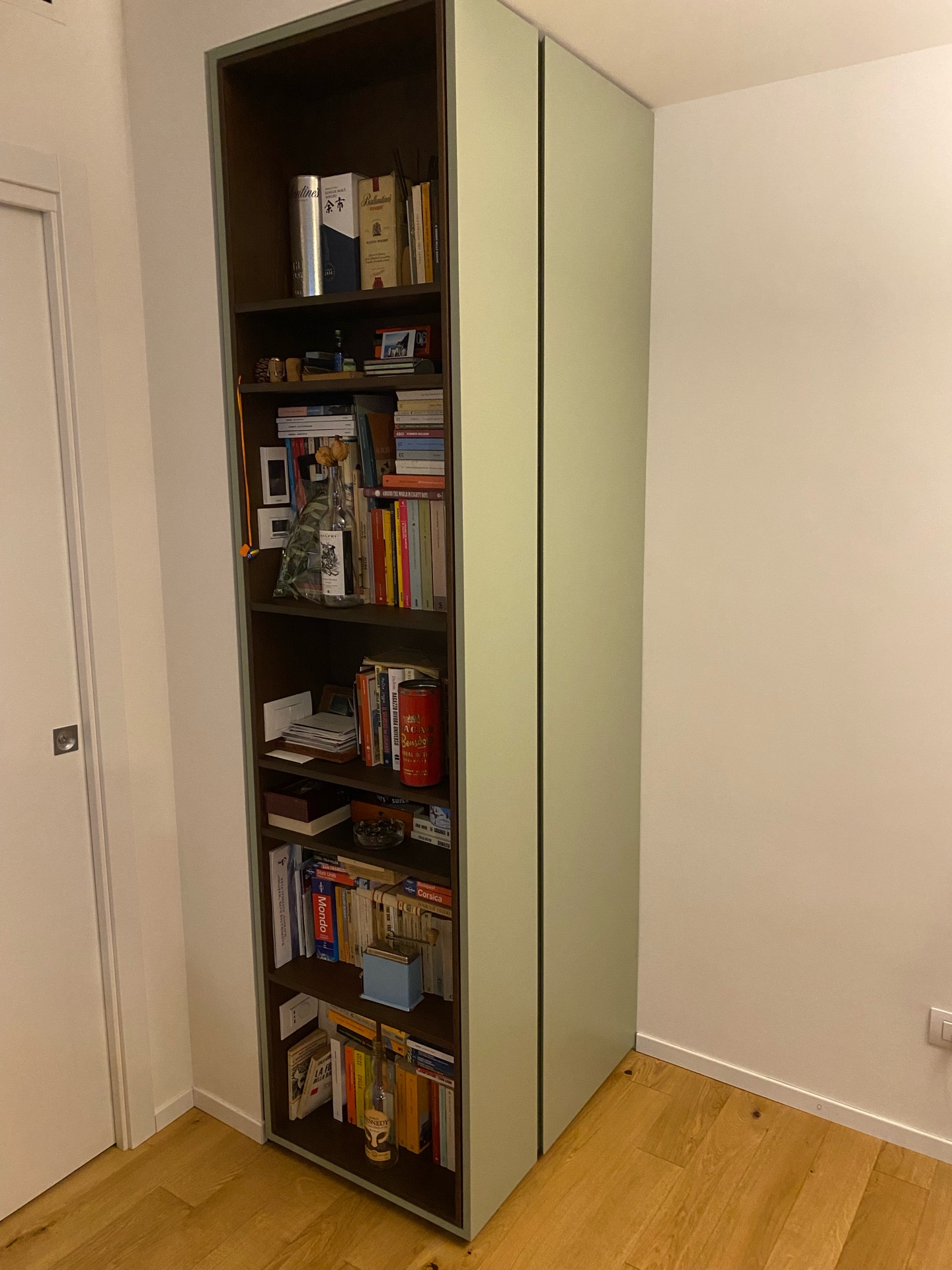In un appartamento ristrutturato risalente agli anni '70, è stata progettata una zona giorno con una porta d’ingresso. Questo progetto ha presentato diverse sfide significative. L’obiettivo principale era quello di realizzare due pareti uniformi per nascondere gli elementi strutturali e di arredamento, ma la forma irregolare della stanza, caratterizzata da nicchie e pilastri, ha reso la progettazione e realizzazione complessa. La parete principale include una boiserie dotata di mensole in legno massello di rovere, che serve anche come supporto per il televisore. Accanto si trova un armadio a tre ante. Per mitigare l’impatto visivo di questa parete imponente, è stato creato un vano a giorno con uno schienale in rovere. A sinistra di questo vano, sono state installate due porte che conducono alla zona notte, sfruttando un’ulteriore nicchia sul lato interno delle porte. La sezione sinistra si conclude con un armadio a due ante e mensole a vista. La seconda parete, situata vicino alla porta d’ingresso, è stata progettata come scarpiera e mobile appendiabiti. Proseguendo lungo il breve corridoio, si trovano la cucina, un tavolo e un piccolo studio, che completano la funzionalità della zona giorno. Ante con apertura push to open.