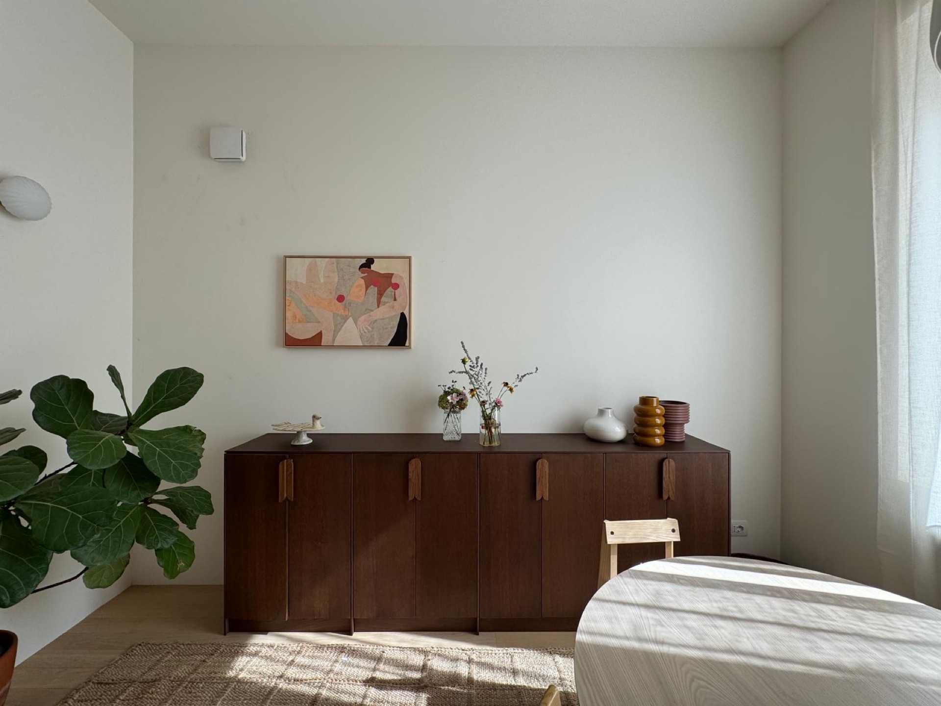 In un appartamento di nuova costruzione, la zona giorno è concepita come un open space che integra cucina e soggiorno. Accanto al divano, è stato progettato un mobile dalle linee essenziali, realizzato in castagno verniciato a campione. Questo mobile da progetto serviva principalmente come supporto per il televisore e presenta fori per il passaggio dei cavi nella parte inferiore del piano. Oltre al divano e al tavolo, all'interno di questo ambiente è stata installata anche una cucina. Le ante dei pensili utilizzano lo stesso materiale e colore del mobile del soggiorno. Per quanto riguarda la cucina, le ante delle basi e delle colonne presentano una finitura laccata opaca e sono dotate di maniglie a scomparsa, ottenute tagliando il bordo delle ante a un angolo di 45º. Infine, il piano e lo schienale della cucina sono realizzati in quarzo.