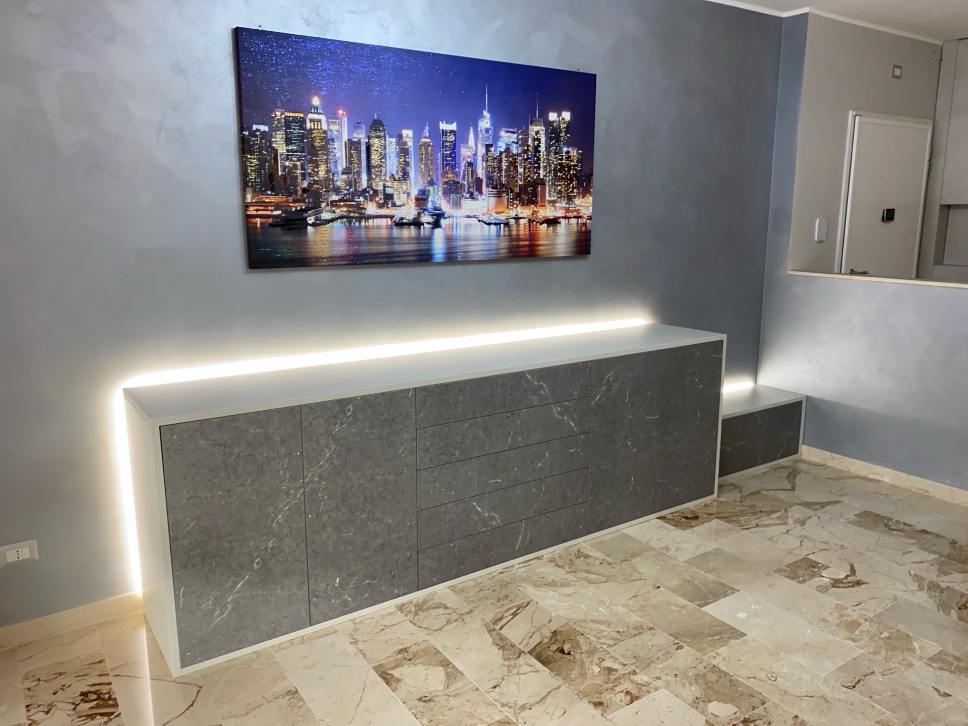 In un appartamento ristrutturato, è stato progettato l'arredamento della zona giorno, composto da tre mobili distinti. Questi includono un mobile soggiorno e TV, una madia e un mobile per l'ingresso. Il mobile soggiorno si distingue per la sua configurazione, con tre basi a terra, di cui una destinata al TV. Sopra a queste due vani a giorno dotati di illuminazione a LED. Inoltre, presenta quattro pensili, anch'essi equipaggiati con luci LED per un'illuminazione ottimale. Di fronte a questo mobile, si trovano il tavolo e la madia, la quale è caratterizzata da ante e cassetti che si aprono mediante il sistema push to open, forniti di ulteriori luci LED. Infine, il mobile per l'ingresso ha una profondità di 35 cm ed è progettato sopratutto per nascondere i contatori e fungere da appendiabiti. Tutti i mobili sono realizzati in laminato, con colori che si coordinano tra loro.