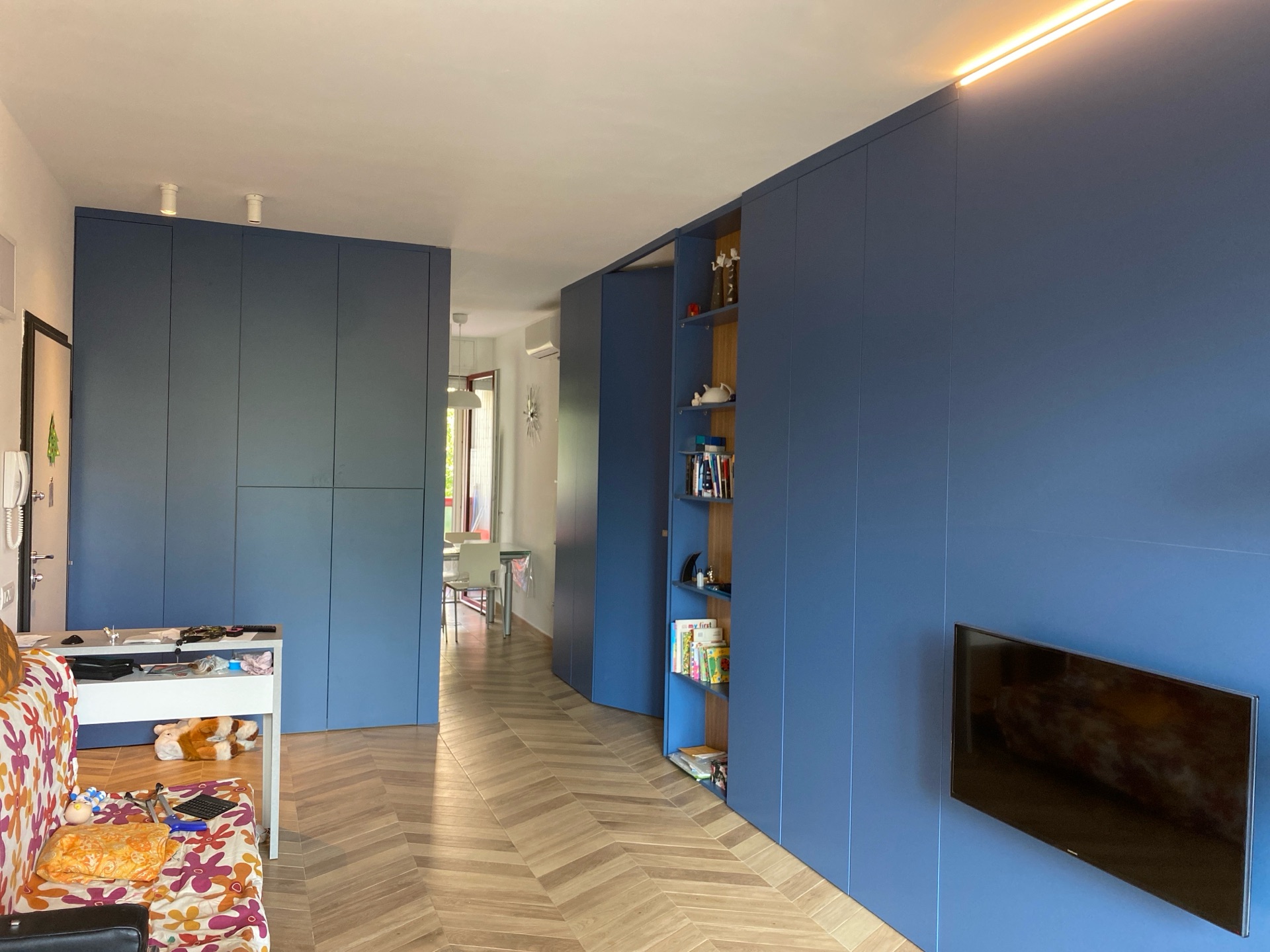 Rinnovo del soggiorno. La zona giorno è organizzata con un divano che divide due aree funzionali. Dietro al divano si trovano un tavolo e un mobile utilizzato come sala da pranzo. Nella parte frontale del divano è stata effettuata una ristrutturazione degli arredi. Il mobile presenta una base sospesa con ante a ribalta, una colonna con anta e ripiani, e una colonna a giorno con ripiani in vetro. Questa colonna è dotata di un'illuminazione LED, controllata tramite un interruttore invisibile. La boiserie è stata creata con pannelli fresati, caratterizzati da una finitura laccata opaca. Durante l'installazione, è stato previsto un spazio minimo per il passaggio dei cavi del televisore. I mobili sono realizzati in laminato, e i colori scelti sono in armonia con quelli degli elementi già presenti, risultando in tonalità simili.