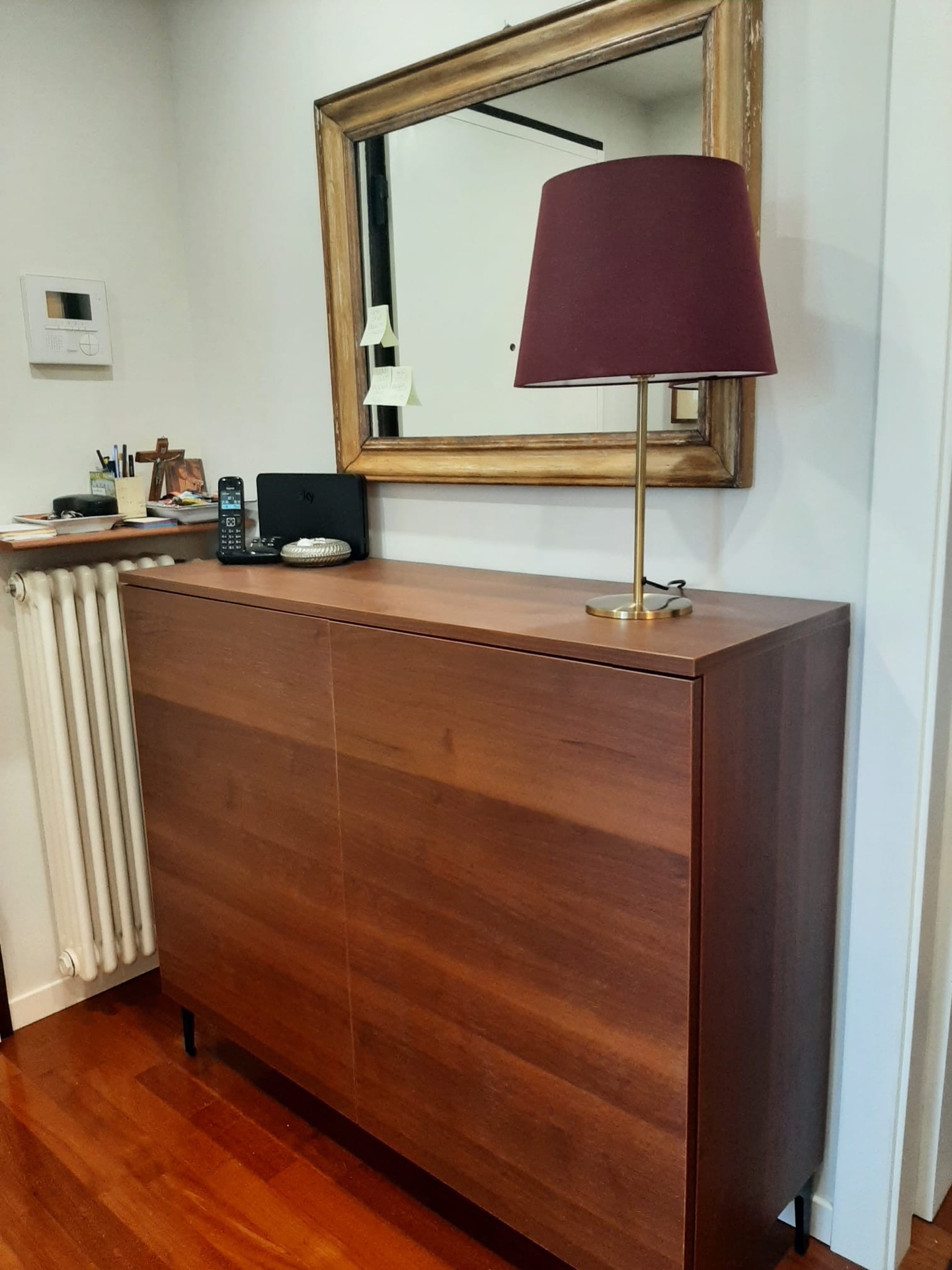 In un appartamento ristrutturato, è stato installato un mobile soggiorno sospeso dotato di due mensole. Il mobile presenta un piano posto in modo sfalsato sulla destra, le ante sono con apertura a ribalta, è realizzato in laminato. Inoltre, nella stessa stanza sono presenti un tavolo e un divano.
